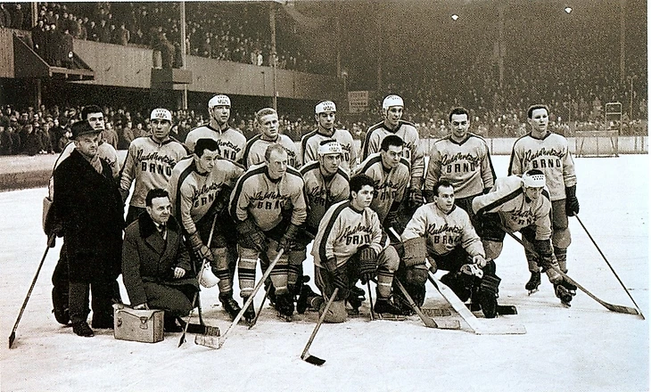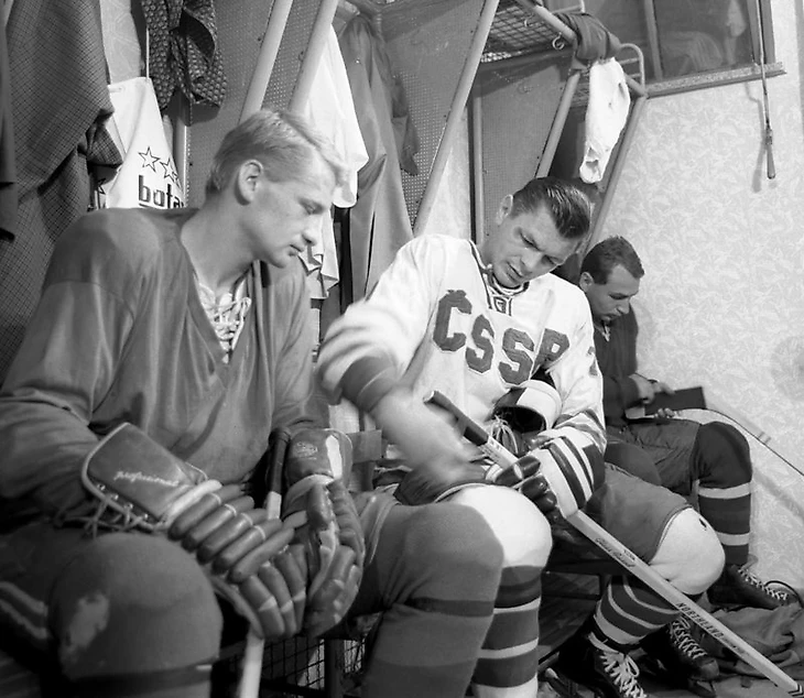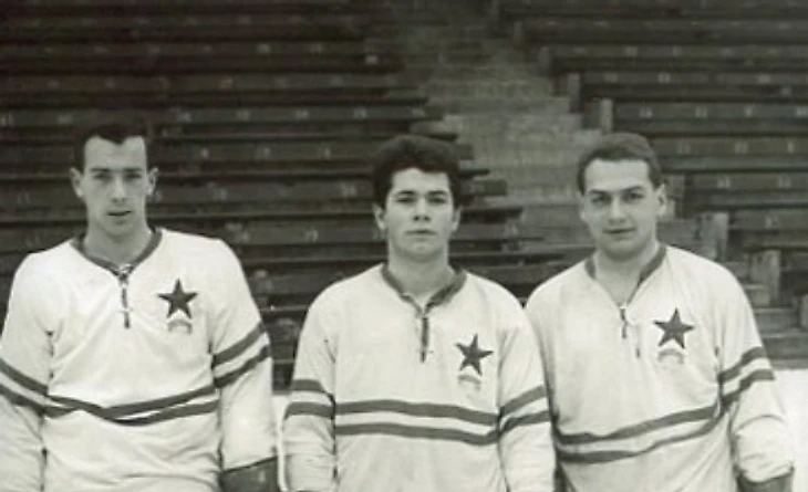 10 марта 1959 года. Прага. Чемпионат мира. Чехословакия - Финляндия - 8:2. «Тренога Иржика». Ярослав Иржик (в центре) со своим постоянным партнером по тройке в сборной Йозефом Голонкой (первый слева)