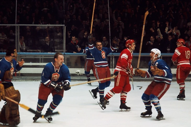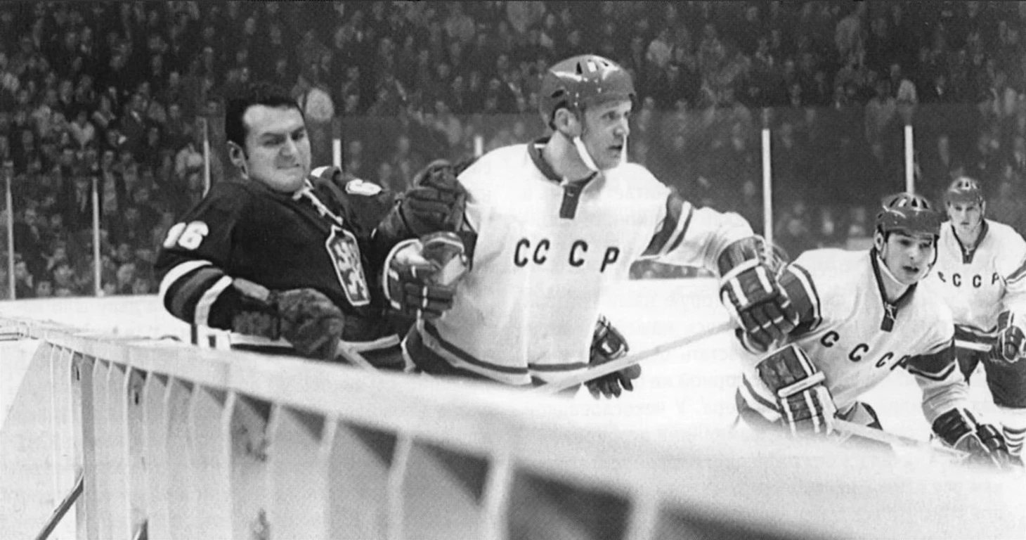 28 марта 1969 года. Стокгольм. Чемпионат мира. Второй круг. СССР - ЧССР - 3:4. Ярослав Иржик с заклеенной звездой над двухвостым львом (в тот вечер его идею с изолентой на гербе поддержало еще несколько партнеров по сборной) против Игоря Ромишевского и Виктора Зингера