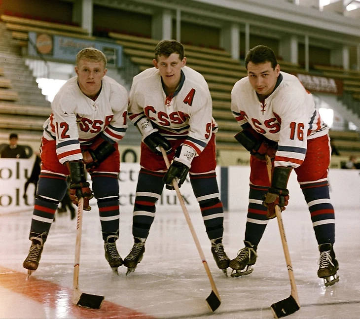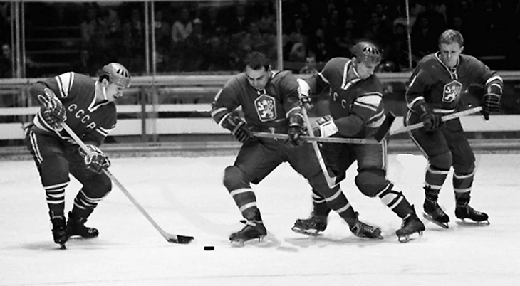 15 февраля 1968 года. Гренобль. Олимпийские игры. СССР - ЧССР - 4:5. Юрий Моисеев (№ 19), Владимир Дзурилла (№ 18), Ярослав Иржик (№ 16) и Евгений Мишаков (№ 10)