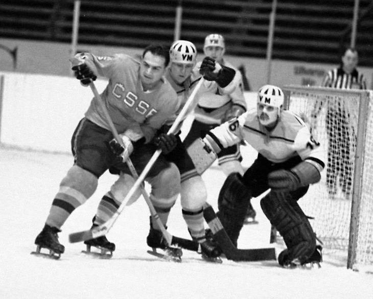 15 февраля 1968 года. Гренобль. Олимпийские игры. СССР - ЧССР - 4:5. Ян Сухи, Вячеслав Старшинов и Ярослав Иржик
