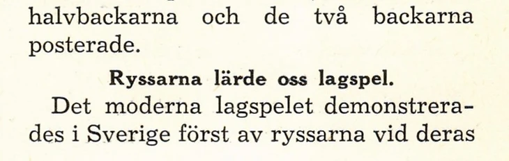 «Русские научили нас командной игре. Современная командная игра была впервые продемонстрирована в Швеции русскими во время их визита в 1907 году. Российские защитники выполнили не только оборонительную задачу, но и как полузащитники поддерживали контакт со своими нападающими при атаке. «Санкт-Петербургский клуб конькобежцев» был подобен машине (а мы то сейчас считаем, что первыми с машиной наших хоккеистов сравнили североамериканцы в разгар «холодной войны»), где разные шестеренки входили друг в друга без трения.