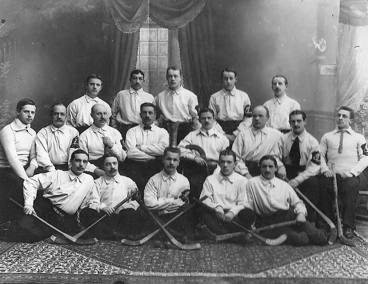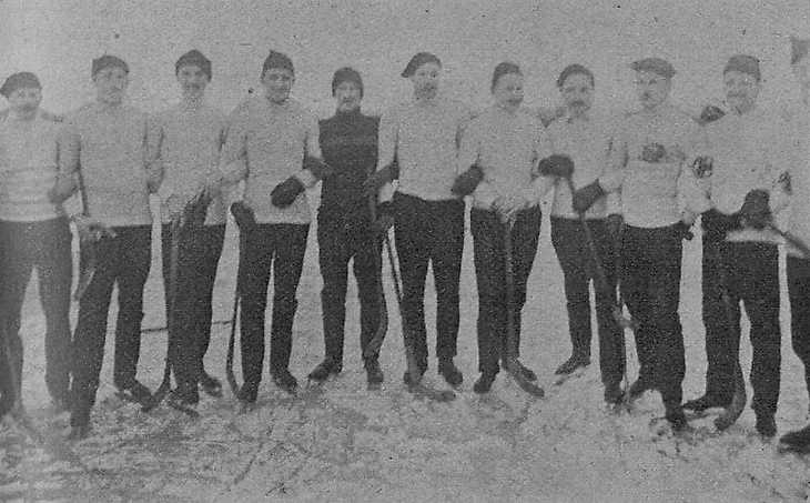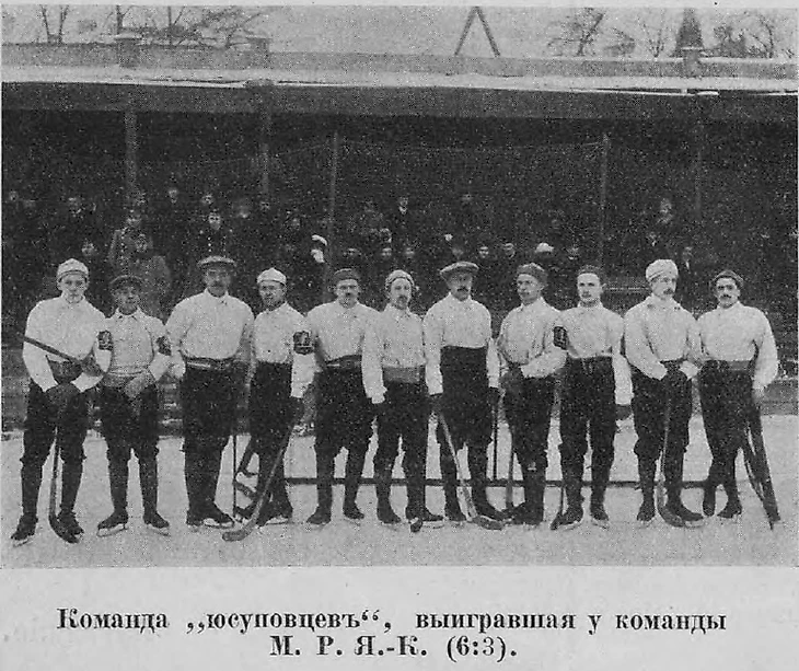 Февраль 1913 года. Санкт-Петербург. Юсупов сад. Хозяева - «Юсуповцы» (с эмблемой на рукаве) и москвичи из «Яхт-клуба» (Императорский Московский речной яхт-клуб / ИМРЯК) с эмблемой на груди