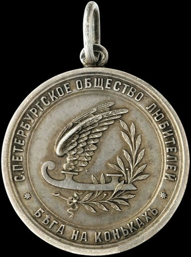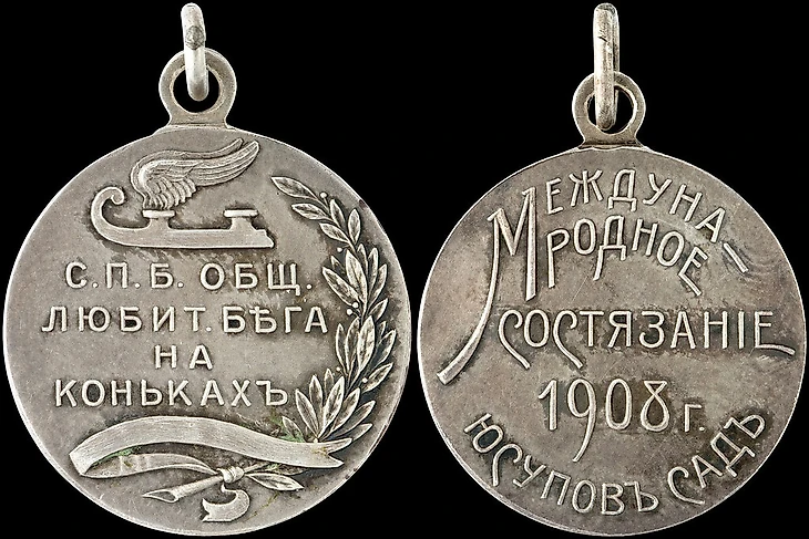 1908 год. Медаль международных состязаний, организованных «Санкт-Петербургским обществом любителей бега на коньках»
