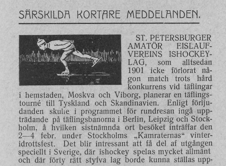 «Хоккейная команда «Санкт-Петербургского общества любителей бега на коньках» [St. Petersburger Amatör-Eislauf-vereins], которая несмотря на сильную конкуренцию на соревнованиях в их родном городе, Москве и Выборге не проиграла ни одного матча с 1901 года, планирует соревновательный тур в Германию и Скандинавию. Согласно предварительным приглашениям, программа поездки должна включать выступления на стадионах в Берлине, Лейпциге и Стокгольме. В последнем месте посещение происходит 2-4 февраля во время стокгольмского «Зимнего спортивного праздника "Камратерна"» (Kamraternas vinteridrottfäst). Будет интересно посмотреть на результат, особенно в Швеции, где в хоккей играют очень широко и где должны быть созданы хорошие сильные команды» (финский журнал на шведском языке «Финскт идротсблад» № 1 за январь 1907 года).
