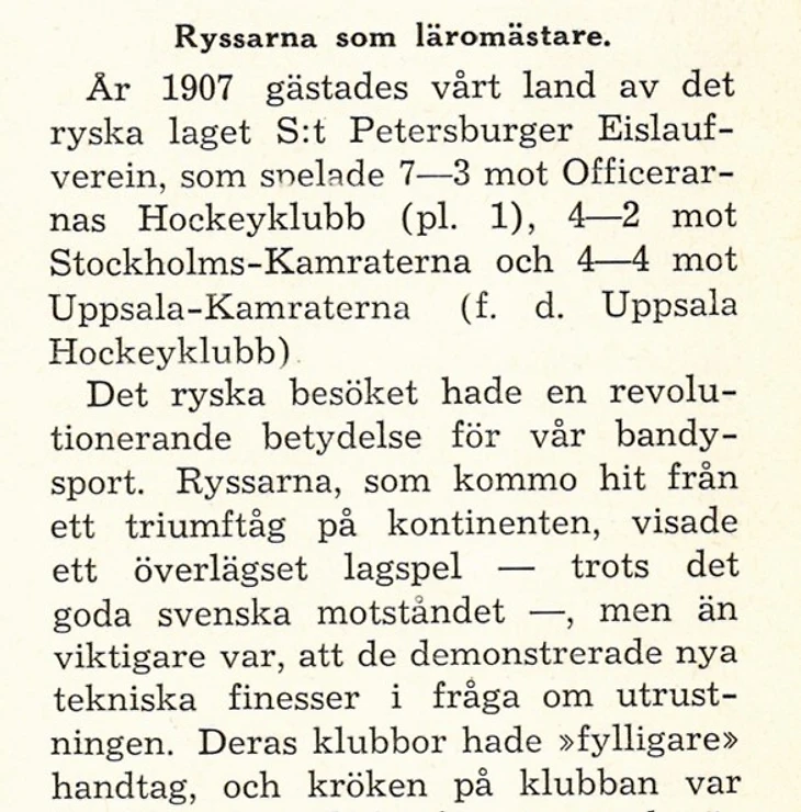 Возвращаемся к поездке «Юсуповцев». Первый том «Энциклопедии по спорту, гимнастике и жизни на природе», выпущенный в серии «Скандинавская семейная книга» в 1938 году констатирует: «Современный шведский бенди считает 1907 год как год своего рождения (после посещения русских). В этом году был разыгран и первый чемпионат Швеции». А что же случилось тогда и при чем тут русские? Вот, что о шведской части этой поездки он пишет: «Русские как учителя. В 1907 году нашу страну посетила российская команда StPetersburger Eislauf-verein («Санкт-Петербургский клуб конькобежного спорта»), который выиграл 7:3 у «Офицерского хоккейного клуба» (Officerarnas Hockeyklubb) , 4:2 у «Стокгольмс камратерна» (Stockholms-Kamraterna [иначе IFK Stockholm или Idrottsföreningen Kamraterna Stockholm, в переводе Спортивное общество «Товарищи» (в честь иллюстрированного журнала шведской молодежи «Камратен» (kamraten - товарищи), на страницах которого в январе 1895 году появился призыв создать общенациональную спортивную организацию, ставшую первой в стране); в русской традиции принято написание ИФК - примечание «ПСФ»]) и сыграл 4:4 с «Упсала камратерна» (Uppsala-Kamraterna [иначе IFK Uppsala), бывшим ХК «Упсала» (Hockeyklubb Uppsala). Визит из России имел революционное значение для нашего хоккейного спорта. Россияне, проехавшие с триумфом по континенту, несмотря на хорошее сопротивление шведов, показали превосходную командную игру. Но, что еще более важно, они продемонстрировали новые технические возможности и снаряжение. В их клубах ручка была «полнее», а изгиб клюшки обернут свиной кожей, делающей прикосновение к мячу более прочным. У русских коньки, приклепанные к ботинкам. Шведы использовали коньки, пристегивающиеся ремнями и имевшие тенденцию слишком часто отваливаться. Гости также показали, что высокий мяч - это не «мертвый» мяч, а так называемый «теннисный» мяч, которым можно управлять как в воздухе, так и на льду».