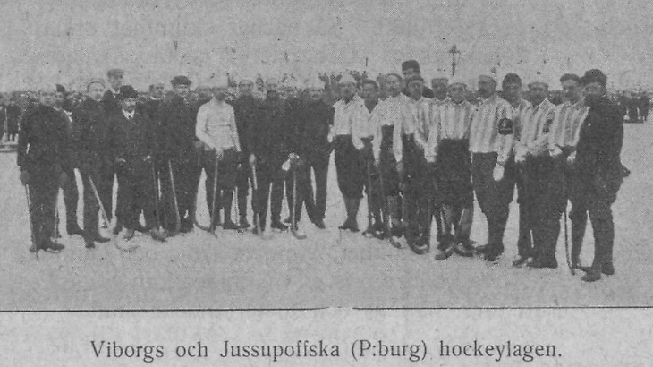 20 февраля 1905 года (?). Выборг. Каток «Выборгского клуба конькобежцев». «Юсуповцы» (в шведском варианте: Jussupoffska или Jussupoffska skridskoklubben - «Юсуповский конькобежный клуб») в своей традиционной бело-синей расцветке и хоккеисты Выборга (фото из журнала «Финскт идротсблад» № 1 за январь 1907 года)