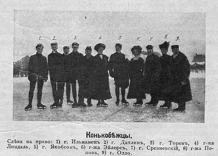 Февраль 1910 года. Выборг. «Северные игры в городе Выборге». Председатель «Санкт-Петербургского общества любителей бега на коньках» Вячеслав Измайлович Срезневский (третий справа) - участник соревнований по фигурному катанию (фото из журнала «Огонек» № 9 от 27 февраля (12марта) 1910 года)