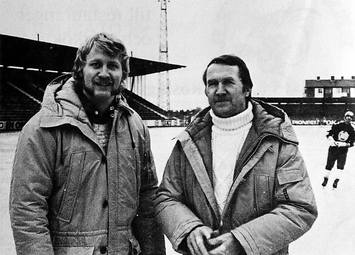 1977 год. Стокгольм. Стадион «Сёдерштадион» («Южный стадион»). Старший тренер стокгольмского «Хаммарбю» Вальтер Ягбрант (справа) со своим помощником и сыном Пером Ягбрантом (hifhistoria.se)
