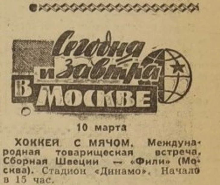 10 марта 1964 года. Москва. Стадион «Динамо». «Фили» (Москва) - сборная клубов Швеции - 1:1 (1:1). Анонс из газеты «Советский спорт» за 10 марта 1964 года