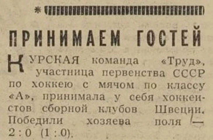 5 марта 1964 года. Курск. Стадион «Трудовые резервы». «Труд» (Курск) - сборная клубов Швеции - 2:0 (1:0). Газета «Советский спорт» за 6 марта 1964 года