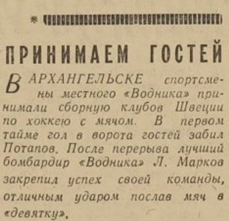 3 марта 1964 года. Архангельск. Стадион «Динамо». «Водник» (Архангельск) - сборная клубов Швеции - 2:0 (1:0). Газета «Советский спорт» за 4 марта 1964 года
