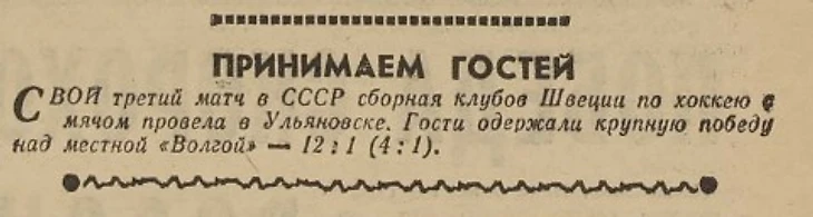 8 марта 1964 года. Ульяновск. «Волга» (Ульяновск) - сборная клубов Швеции - 1:12 (1:4). Газета «Советский спорт» за 10 марта 1964 года