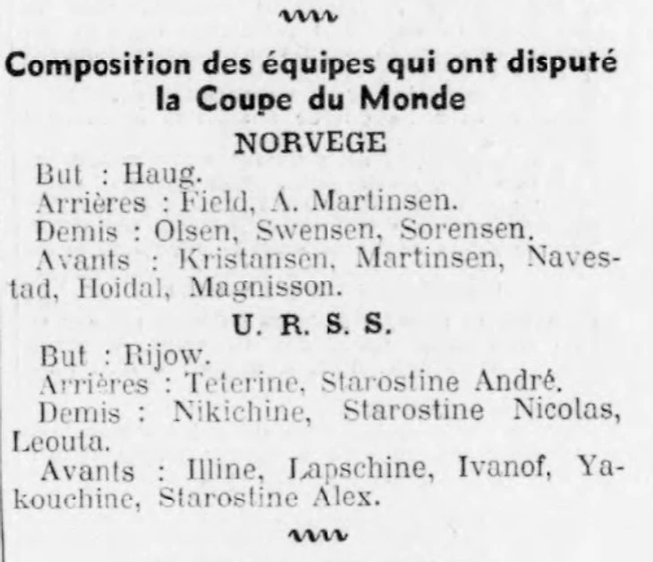14 августа 1934 года. Кубок мира КСИ по футболу. Большой Париж. Монруж. Стадион «Буффало» / Stade Buffalo. 25 000 зрителей. Финал. СССР - Норвегия - 3:0 (2:0). Составы команд (от вратаря до правого крайнего нападающего) из парижского еженедельника «Спорт» № 47 от 22 августа 1934 года, в которых в частности неверно указаны амплуа братьев Старостиных: Николя, Александра и Андрэ, фамилия норвежского вратаря Хуго Карлсена. СССР (от вратаря до левого крайнего нападающего): Иван Рыжов; Александр Старостин и Виктор Тетерин; Станислав Леута, Андрей Старостин и Евгений Никишин, Николай Старостин, Михаил Якушин, Сергей Иванов, Алексей Лапшин и Сергей Ильин. Норвегия (от вратаря до левого крайнего нападающего): Хуго Карлсен/Hugo Karlsen, Ларс Мартинсен/Lars Martinsen, Од Фьельд/Odd Fjeld , Оге Сёренсен/Aage Sørensen, Еуген Свендсен/Eugen Svendsen, Вильгельм Ульсен/Wilhelm Olsen, Карл Магнуссен/Karl Magnussen, Сигурд Хёйдаль/Sigurd Høidahl, Улав Навестад/Olav Navestad, Альф Мартинсен/Alf Martinsen и Пауль Кристенсен