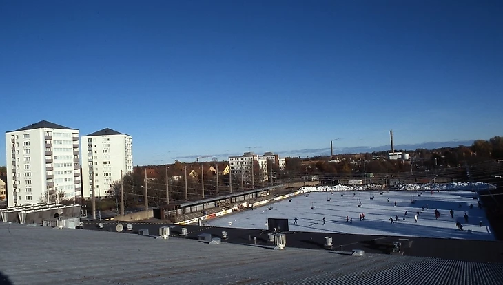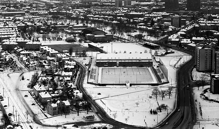 19 марта 1969 года. Швеция. Эребру. На переднем плане каток для бенди «Винтерштадион»/Vinterstadion (ныне «Берн-Арена»/Behrn Arena), на заднем плане футбольный стадион «Эйраваллен»/Eyravallen (ныне «Берн-Арена»/Behrn Arena) / фото из архива газеты «Эребру курирен»; digitaltmuseum.se