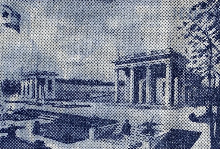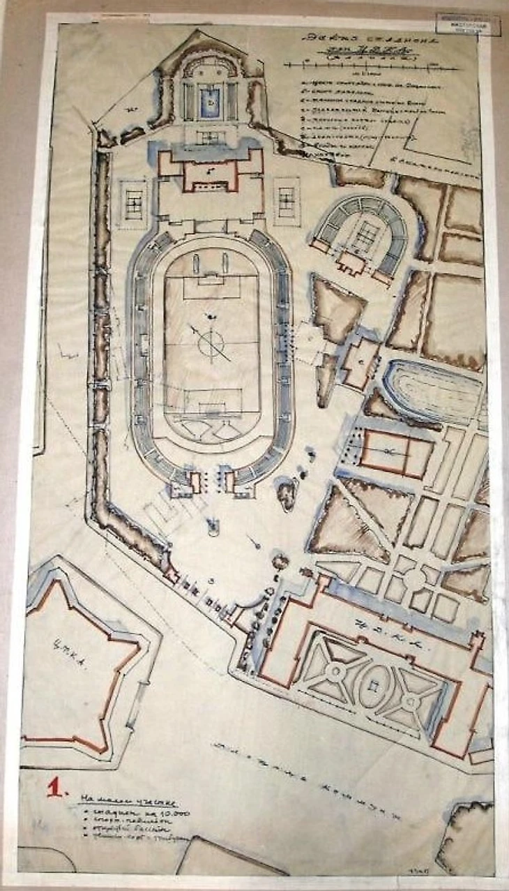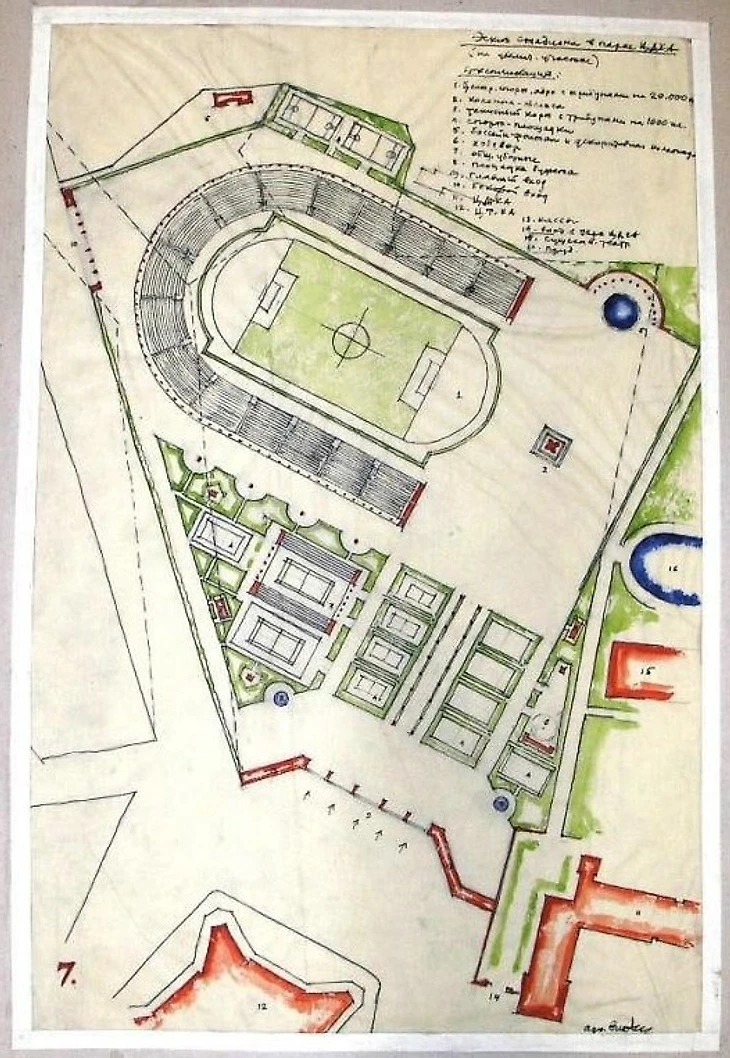 1947 год. В.О. Мунц. Эскиз спортивного комплекса в парке ЦДСА (трибуны футбольно-легкоатлетической арены на 20 000 зрителей) с ликвидацией теннисного стадиона, раскритикованного за «крупнейшие технологические и архитектурно-планировочные недостатки» (музей архитектуры имени А.В. Щусева / goskatalog.ru)