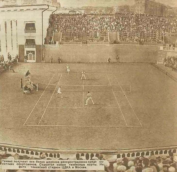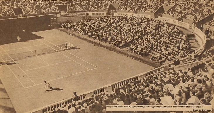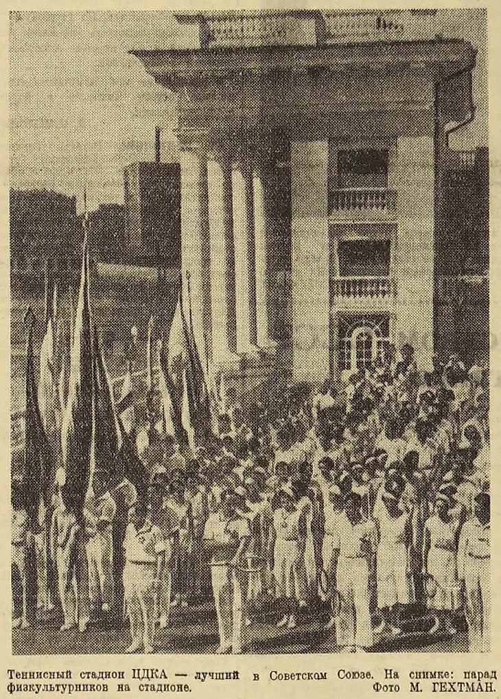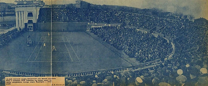 «Самый большой в Советском Союзе теннисный стадион открыт. Он скрыт в глубине парка Центрального Дома Красной Армии, и лишь высокие трибуны на 5 000 мест обнаруживают его местонахождение. Вчера впервые зрители прошли мимо красивых газонов и скульптурных изображений спортсменов, чтобы занять места на новом стадионе. Эффектное архитектурное оформление главного входа, удобное расположение мест на трибунах, с которых одинаково хорошо виден теннисный корт, многочисленные проходы, исключающие возможность встречных людских потоков, – таковы главные особенности этого прекрасного нового спортивного сооружения» (газета «Вечерняя Москва» № 184 от 11 августа 1936 года).