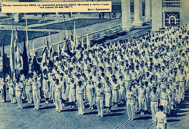 24 мая 1937 года. Парк ЦДКА. Парад открытия сезона на теннисном стадионе ЦДКА (фото М. Гехтмана из газеты «Красный спорт» № 56 от 23 апреля 1938 года)