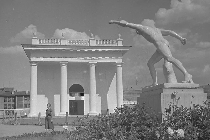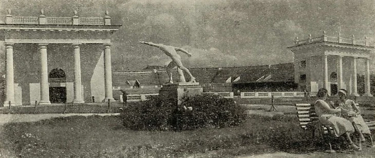 1939 (?) год. Парк ЦДКА. Теннисный стадион – массовый театр ЦДКА. Слева скульптура работы Мариамны Столпниковой «Теннисистка», копии которой были также размещены в ПКиО имени Горького (Москва) и у Дворца культуры металлургов (Сталинск / ныне Новокузнецк)