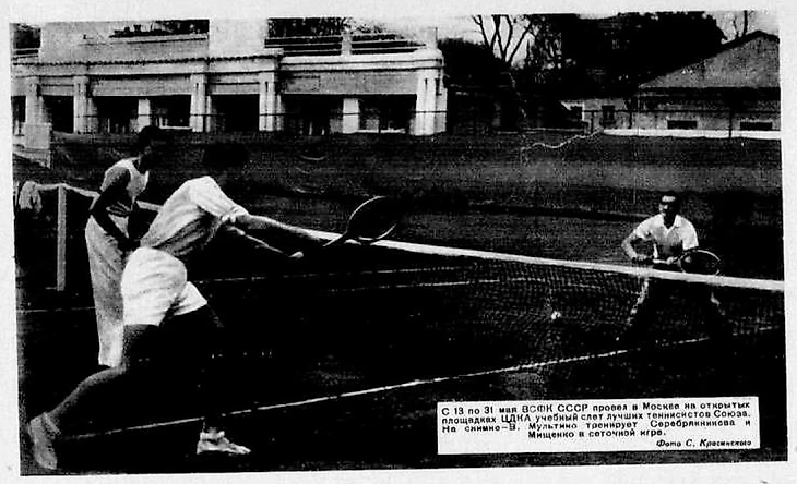 30 июня 1938 года. Парк ЦДКА. Теннисный стадион ЦДКА. Товарищеский матч между сборной Москвы и пражским Центральным клубом закрытых площадок / ЦЦЦ / ССС (фото И. Фетисова из газеты «Вечерняя Москва» № 148 от 1 июля 1938 года)
