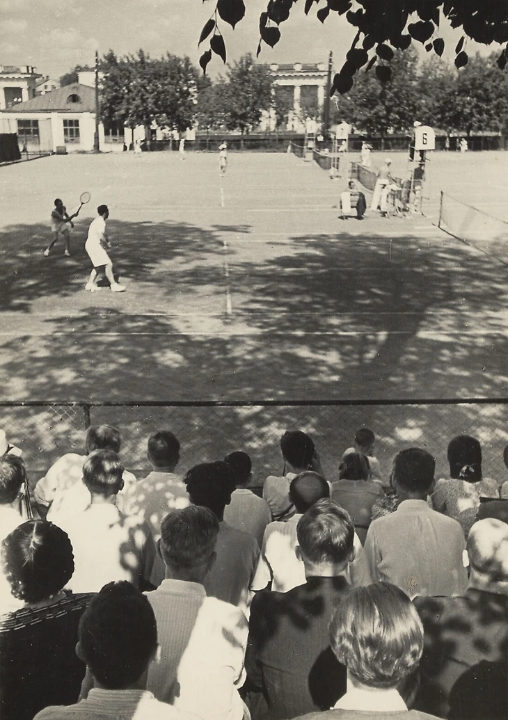 16 июня 1946 года. Парк ЦДКА. Теннисные корты. Первенство Москвы (фото А. Гинцбурга / Библиотека Гарвардского университета). На дальнем плане – теннисный стадион-массовый театр ЦДКА