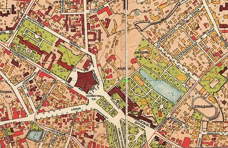 Рубеж 1940-50-х годов. Парк ЦДСА и его окрестности на фрагменте плана Москвы 1952 года (retromap.ru). «Пустырь» рядом с подковой, место, где устраивался каток, на котором играли хоккеисты ЦДКА