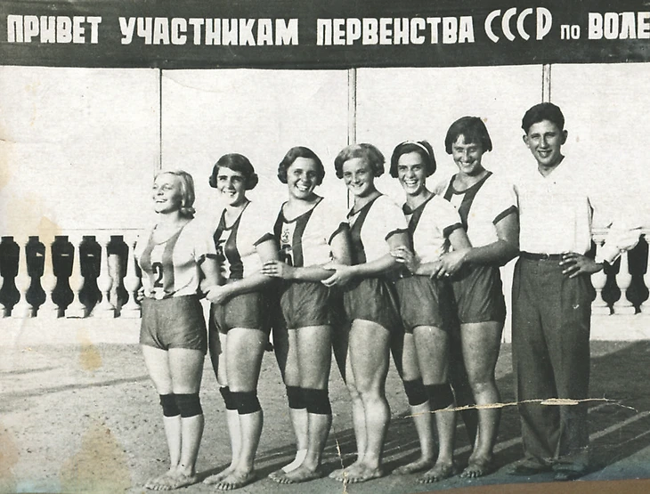 26-30 августа 1938 года. Парк ЦДКА. Теннисный стадион ЦДКА. Первенство СССР по волейболу. Женские команды. Финальный турнир. Третий призер соревнований – «Рот Фронт» (Москва) и его тренер Григорий Берлянд (smsport.ru)