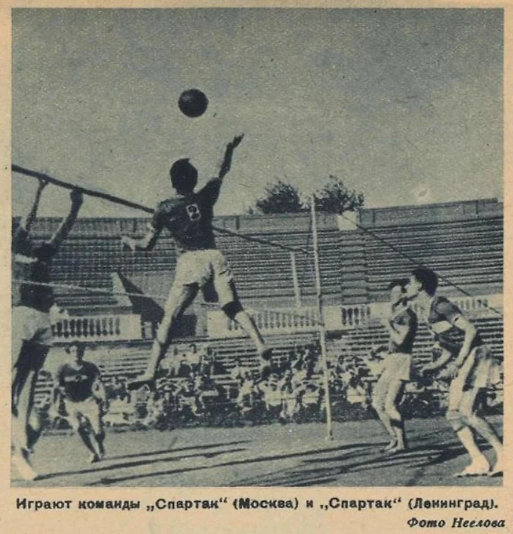 26-30 августа 1938 года. Парк ЦДКА. Теннисный стадион ЦДКА. Первенство СССР по волейболу. Финальный турнир. Игра между спартаковскими командами Москвы и Ленинграда, в которой гости, ставшие чемпионами, победили 2:0 (фото О. Неелова из журнала «Физкультура и спорт» № 18 за 1938 год)