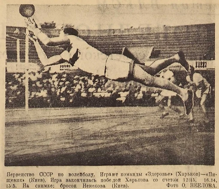 26-30 августа 1938 года. Парк ЦДКА. Теннисный стадион ЦДКА. Первенство СССР по волейболу. Финальный турнир. «Здоровье» (Харьков) – «Пищевик» (Киев) – 1:2 (фото О. Неелова из газеты «Красный спорт» № 119 от 1 сентября 1938 года)