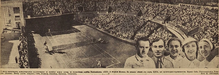 1 июля 1938 года. Парк ЦДКА. Теннисный стадион ЦДКА. Товарищеский матч между сборной Москвы и пражским Центральным клубом закрытых площадок / ЦЦЦ / ССС (фото М. Гехтмана из газеты «Красный спорт» № 90 от 3 июля 1938 года)