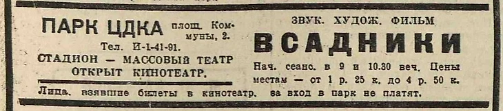 Август 1939 года. Теннисный стадион – массовый театр. Афиша звукового художественного фильма «Всадники» режиссера Игоря Савченко о борьбе партизанского отряда с германскими оккупантами и украинскими националистами во время Гражданской войны из газеты «Вечерняя Москва» (№ 174 от 1 августа 1939 года)