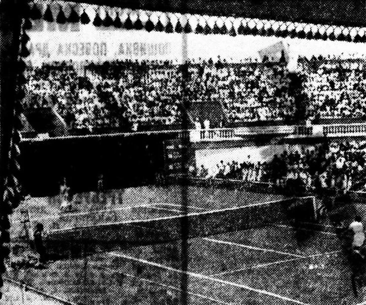 «Четырехугольник теннисного корта, вписанный в полукруг крутых трибун» ( газета «Красный спорт» № 89 от 1 июля 1938 года).