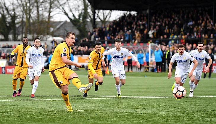 Решающий момент в матче: капитан «Саттон Юнайтед» Джейми Коллинз забивает «Лидсу» с пенальти.