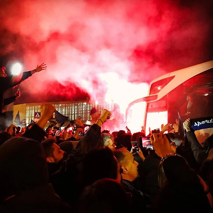 В Бергамо «Аталанту» ждали 5 тысяч болельщиков, которые создали в аэропорту атмосферу футбольного стадиона – с пиротехникой, флагами и песнями о победе в чемпионате.