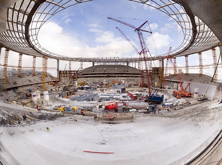 Виталий Мутко недавно заявил, что работы на «Екатеринбург-Арене» идут с опережением графика (кстати, так говорили и год назад). По оценке застройщика, компании «Спорт-Инжиниринг», готовность объекта – чуть более 60% (месяц назад было 54%). В апреле планируется приступить к обустройству футбольного поля.