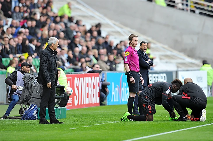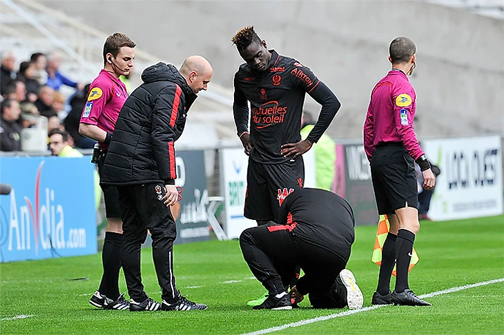Волшебный итальянский форвард Марио Балотелли забил в этом сезоне за «Ниццу» уже 10 голов во французской лиге, но мир сейчас обсуждает и репостит, конечно, не это. В субботу в матче с «Нантом» Балотелли попал в очередную историю из числа тех, в которые, кажется, попадает только он. Перед самым началом игры Марио почувствовал, что зашнуровал бутсы слишком туго, но сам ситуацию исправить не сумел. Пришлось идти на бровку, звать помощников и пропустить первые полторы минуты матча.