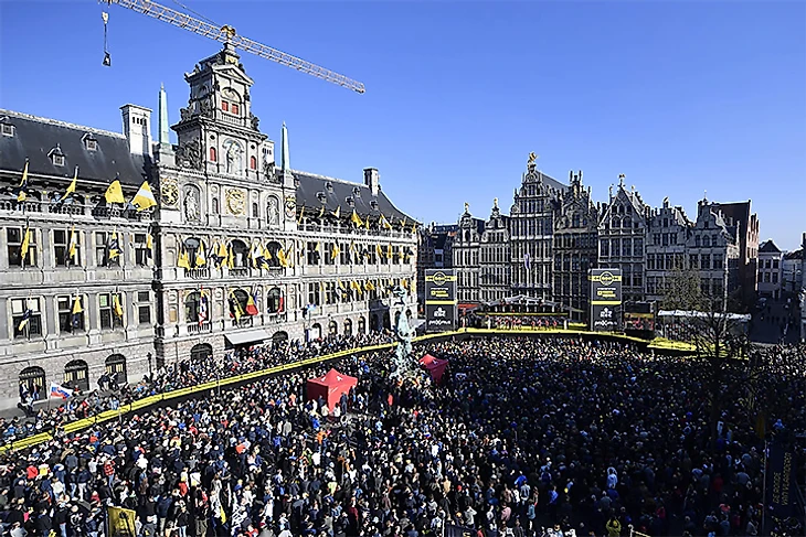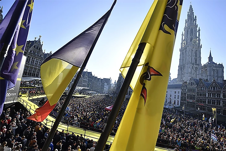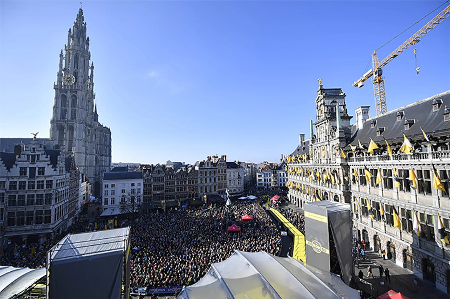 Площадь Антверпена, где стартовала гонка, с 7 утра была переполнена. Ажиотаж: палатки с едой, сувенирами, спортивной одеждой и массовые конкурсы для болельщиков, которые смотрят вело на больших экранах.