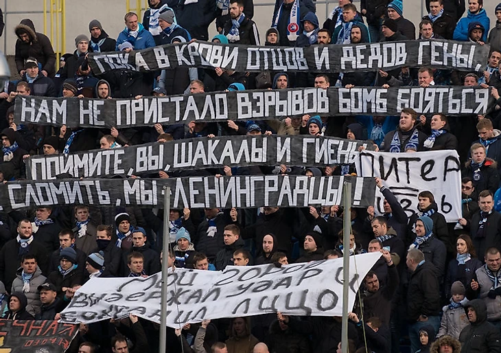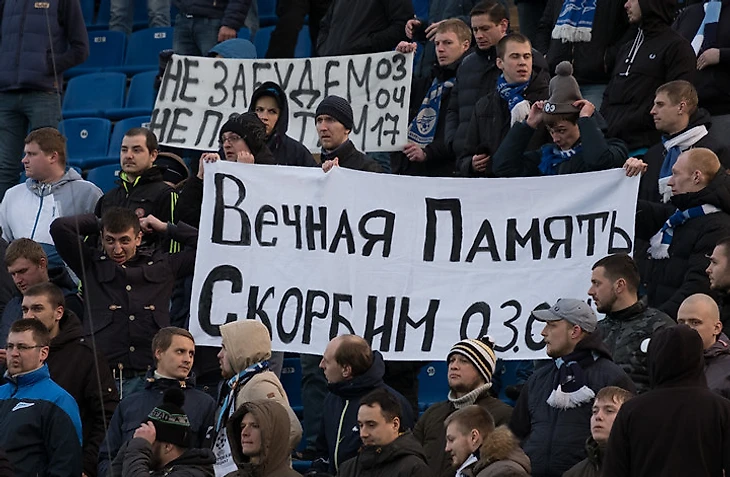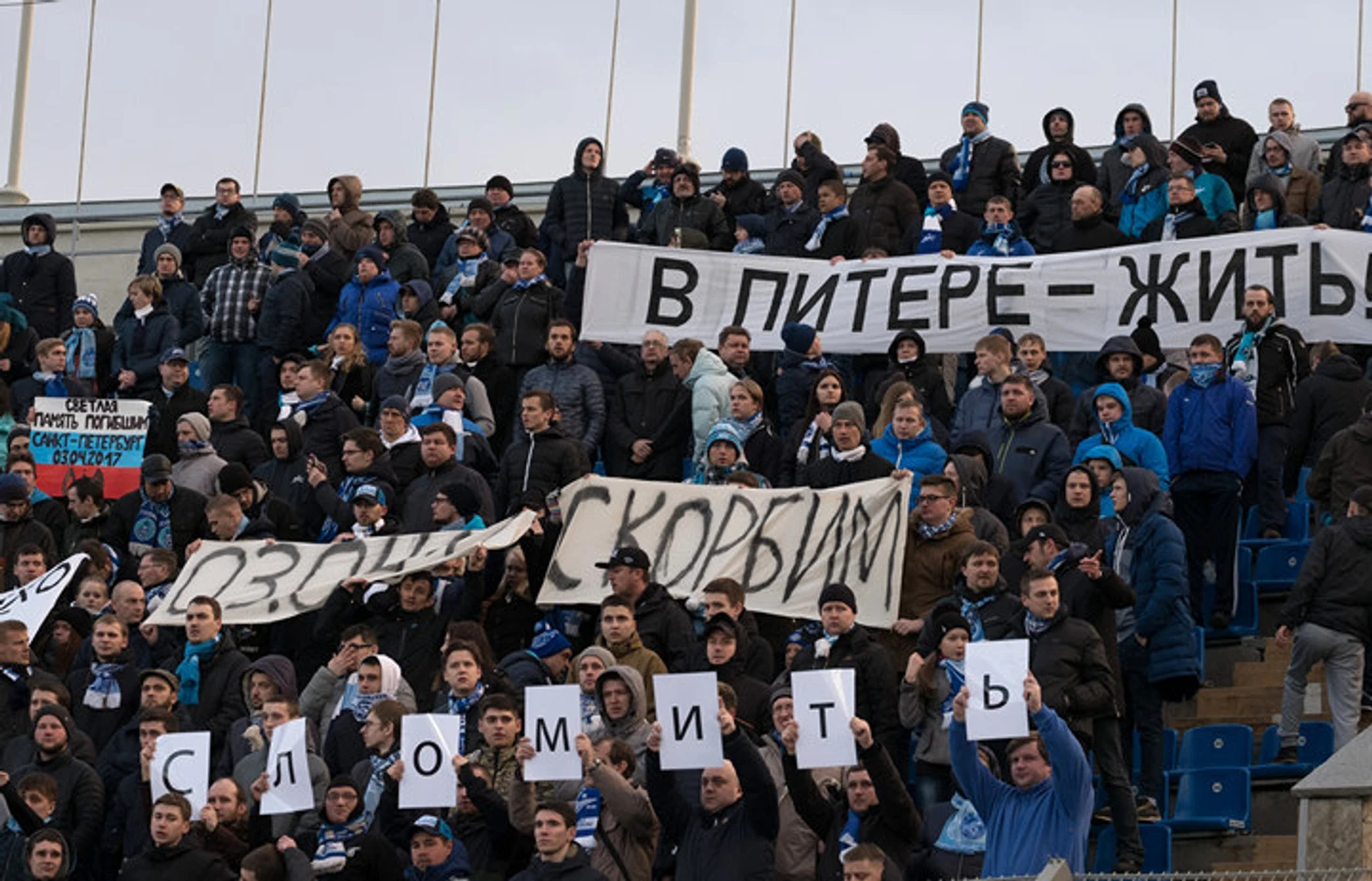 Во время матча «Зенит» – «Анжи» болельщики почтили память погибших в теракте в петербургском метро и ответили организаторам преступления серией баннеров. На вираже был растянут длинный баннер «Нас не сломить, не запугать. Мы будем жить и побеждать!»