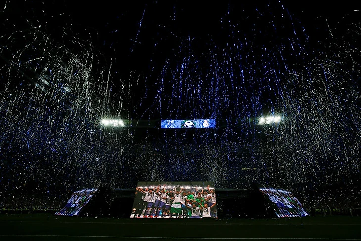 А вот как выглядело празднование на переполненном «Сантьяго Бернабеу», где собрались болельщики «Реала». Освещение отключили, все смотрели в экраны на поле.