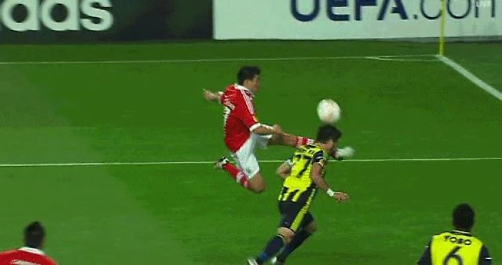 Николас Гайтан из «Бенфики» хотел попасть по мячу, а попал по лицу Гекхану Генюлю из «Фенербахче».
