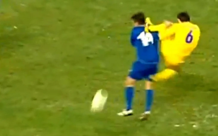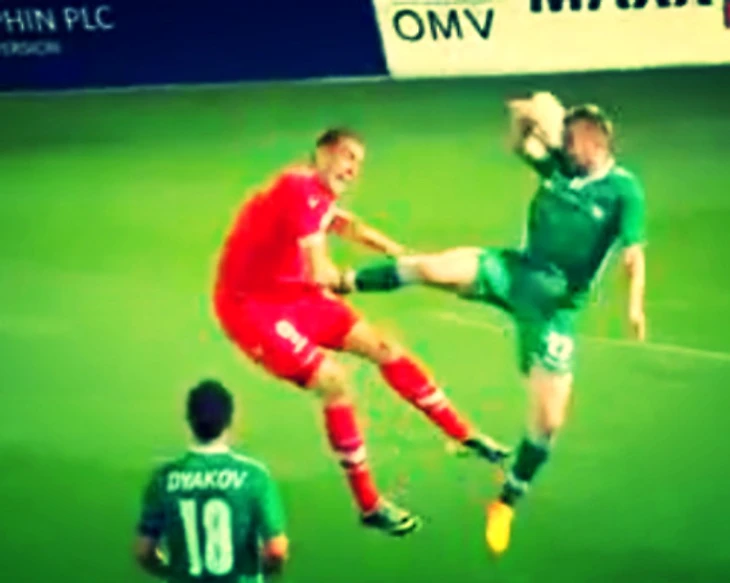Защитник «Лудогорца» Космин Моци влетел в звезду софийского ЦСКА Стефана Николича. Вы не поверите, но судья тут не увидел даже нарушения. А ведь это тот самый Моци, который встал в ворота вместо удаленного вратаря и отразил два пенальти с серии со «Стяуа» в квалификации ЛЧ.
