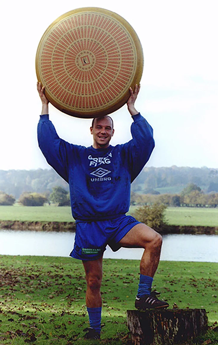 30. Игрок сборной Англии Стив Стоун после тренировки с огромным сыром. Наверняка были причины: