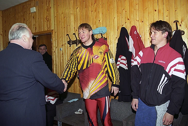 33. Черномырдин в раздевалке «Спартака». На Евсееве тот самый спортивный костюм: