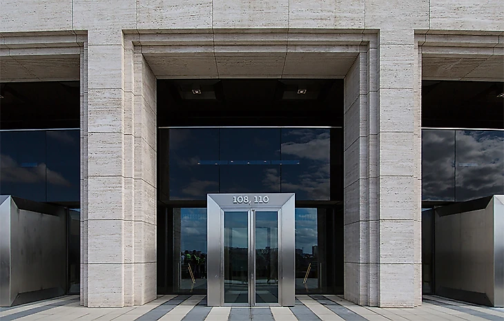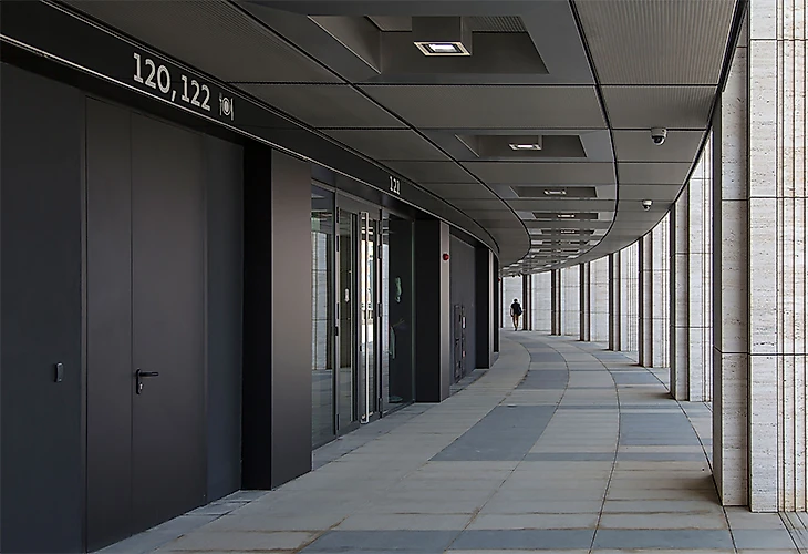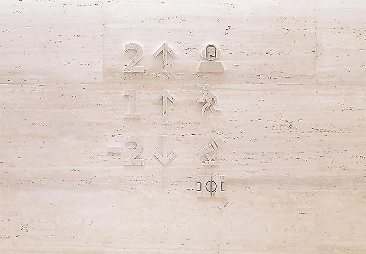 Часть навигации постоянна — это объемные знаки, выполненные из тех же материалов, что и поверхность: например, травертиновые указатели на стенах из травертина и металлические пиктограммы на дверях из металла. Они хорошо видны вблизи и сливаются с покрытием при взгляде издалека, не нарушая цельность интерьера и экстерьера.