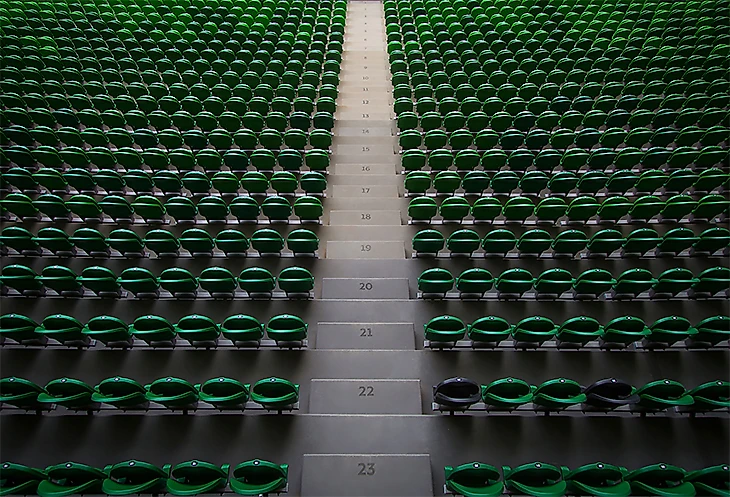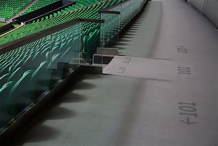 Номера секторов, рядов и мест нанесены краской, оттенок которой имитирует тень. Знаки незаметно встраиваются в пространство и не раздражают зрителей. Так как пол на трибунах окрашен градиентом, для каждого участка подобраны расцветки, соответствующие оттенку покрытия и гармонично сочетающиеся друг с другом.