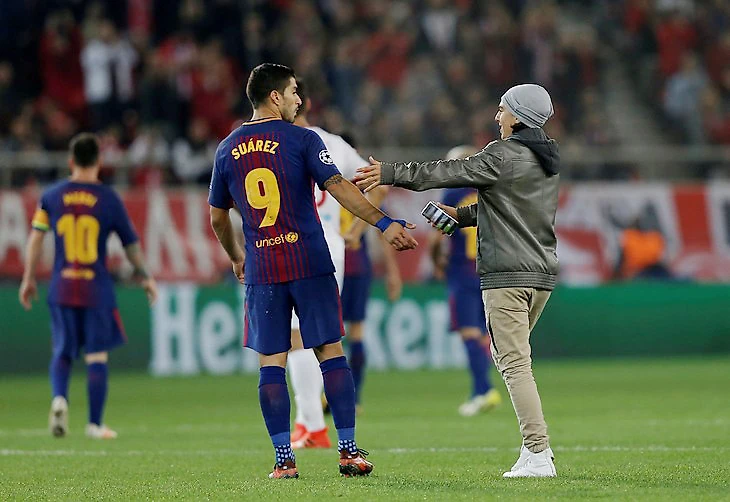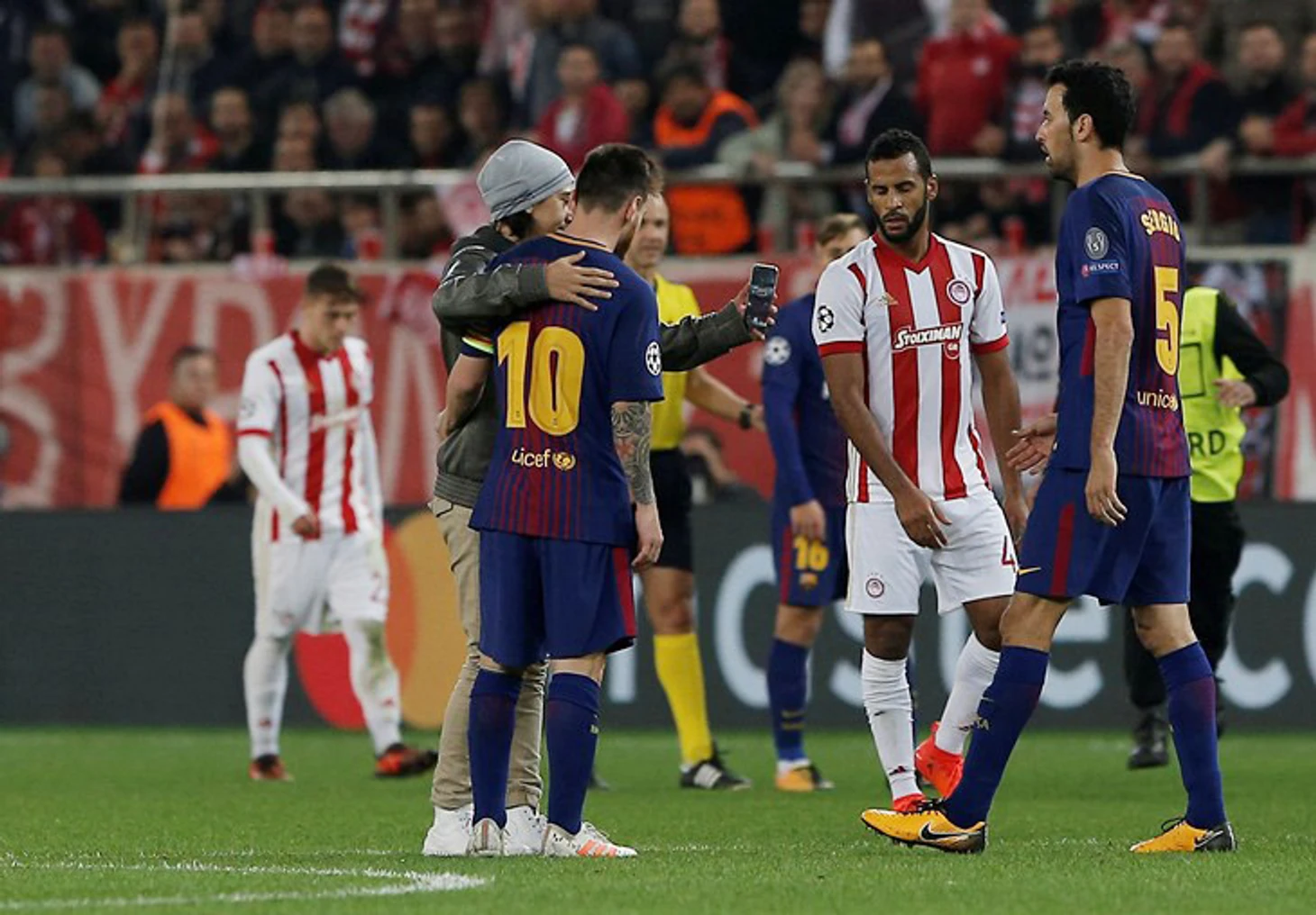 В матче Лиги чемпионов в Пирее «Олимпиакос» отстоял ничью против «Барселоны», а двое фанатов Лионеля Месси выбежали на поле.