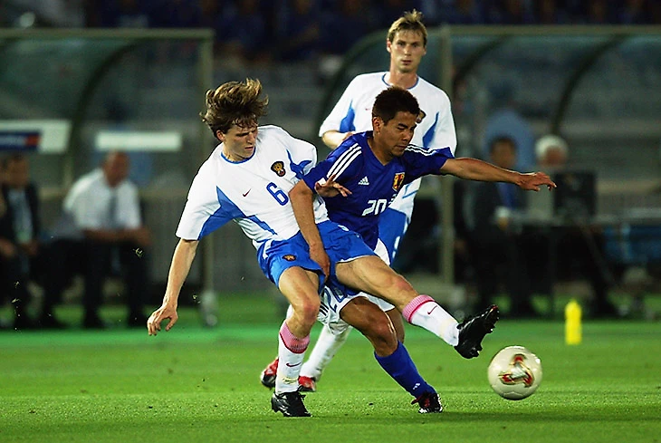 ЧМ-2002. В те годы основной комплект формы обычно был бело-синим. Для Евро-2004 Nike сделал похожую, «парашютную», форму, только вокруг номера появился круг.