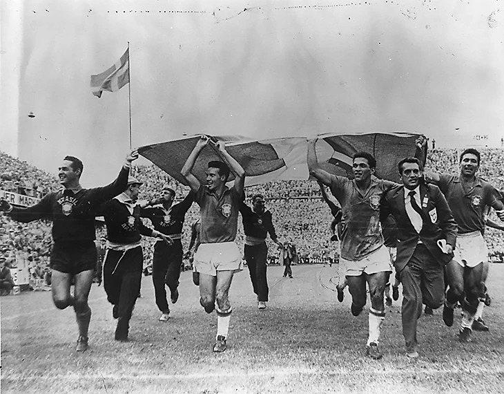Бразильцы бегут круг почета со шведским флагом, чтобы отблагодарить местных зрителей за поддержку. Третий справа – еще одна легенда Бразилии: Гарринча.