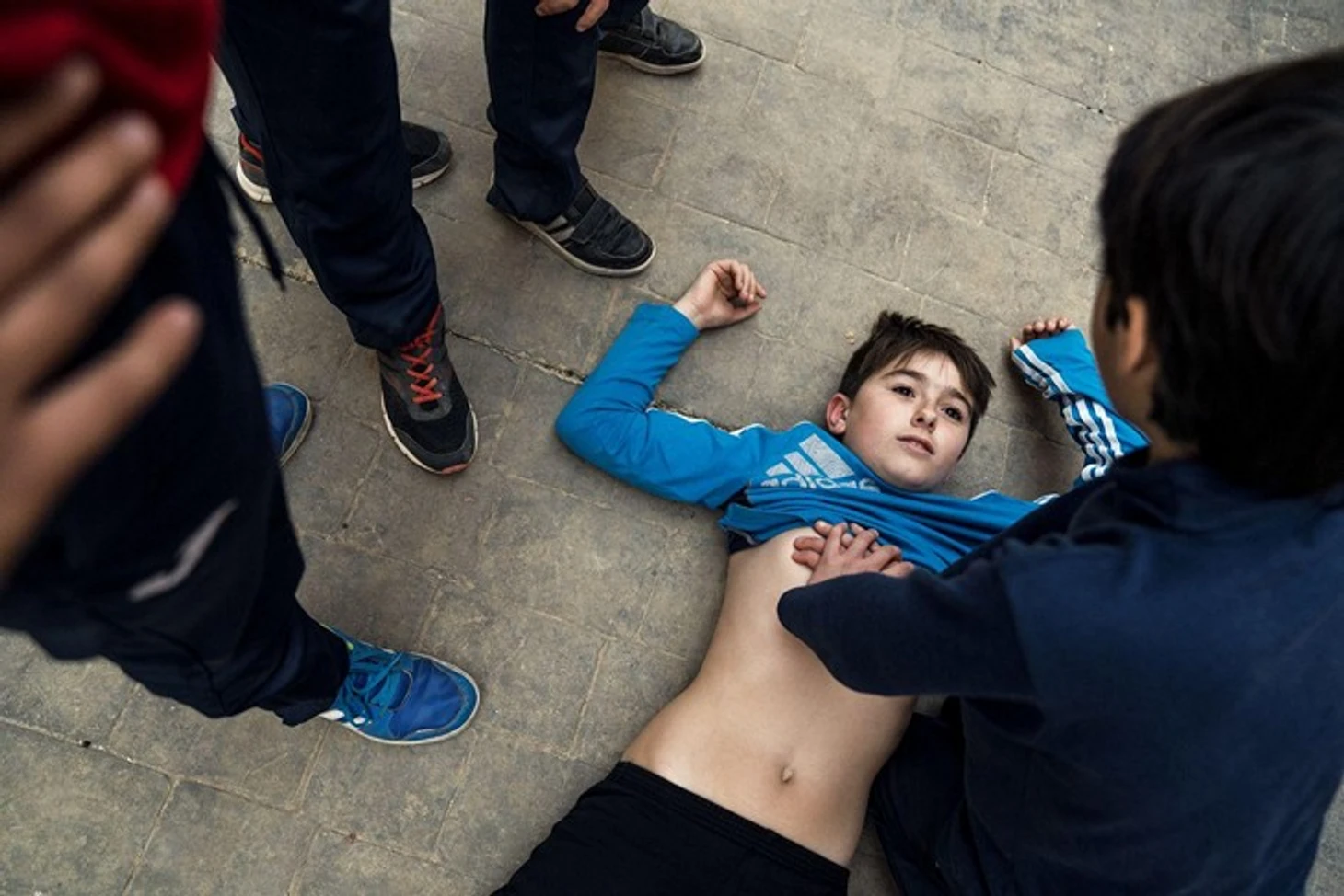 Ребята тренируются проводить сердечно-легочную реанимацию на своем друге после того, как его ударил кукольный бык на колесах.