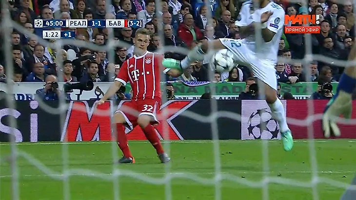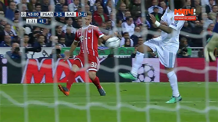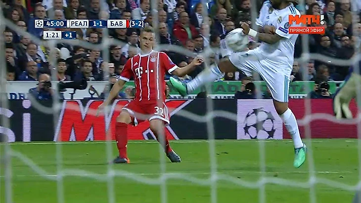 Самый скандальный момент полуфинала в Мадриде случился в компенсированное время первого тайма: атака «Баварии» завершалась подачей Киммиха справа. Мяч ударился в руку выпрыгнувшего Марсело – бразилец находился в своей штрафной, мяч встретился с ладонью/запястьем и значительно изменил направление полета.