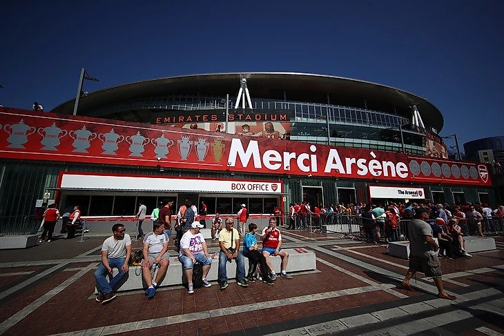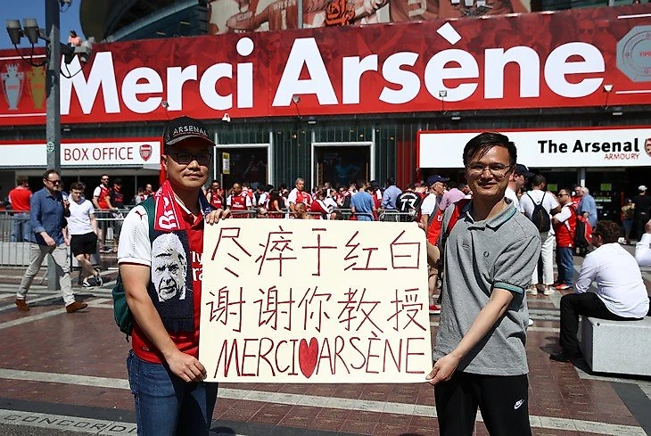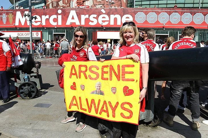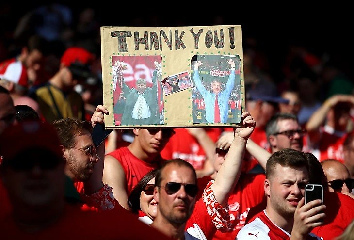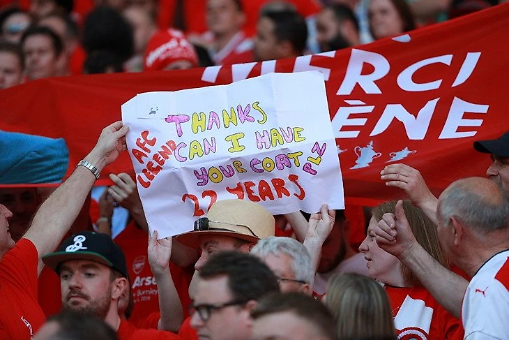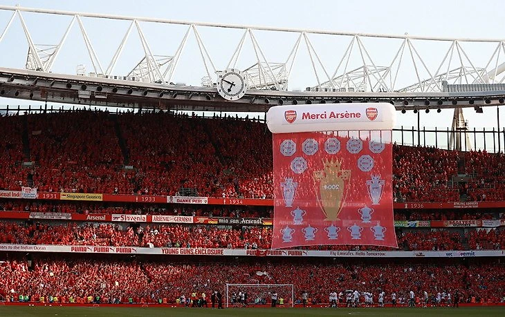 У входа на стадион растянули огромный баннер Merci Arsene – с изображениями титулов француза.